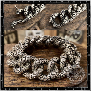 200g以上の重量は満足感と着け応えに満ち溢れています。夏に半袖でその存在感を主張するのも良いですが、これからの季節に袖口からこのとんでもなくヘヴィなブレスレットが覗き見えるのもクールではないでしょうか。